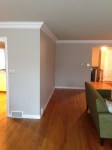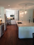 I thought you might enjoy photos of my Franklin Avenue project that is almost finished. We removed the load-bearing walls that once separated the kitchen from the dining room and living room (refer to before photo above) to create an open concept kitchen with a large island (well, actually it is a peninsula, since it is anchored by a wall at one end). The new structural beam is neatly tucked into the roof structure to create an uninterrupted ceiling plane. I specified the Sabine Hill concrete tiles for the backsplash behind the range that I featured in a previous post. The countertops are Lagoon Silestone that look similar to Carrara marble but without the maintenance issues of marble. The doors and drawers are a combination of high gloss white and flat-sawn walnut veneer. Stay tuned for more detailed photos.